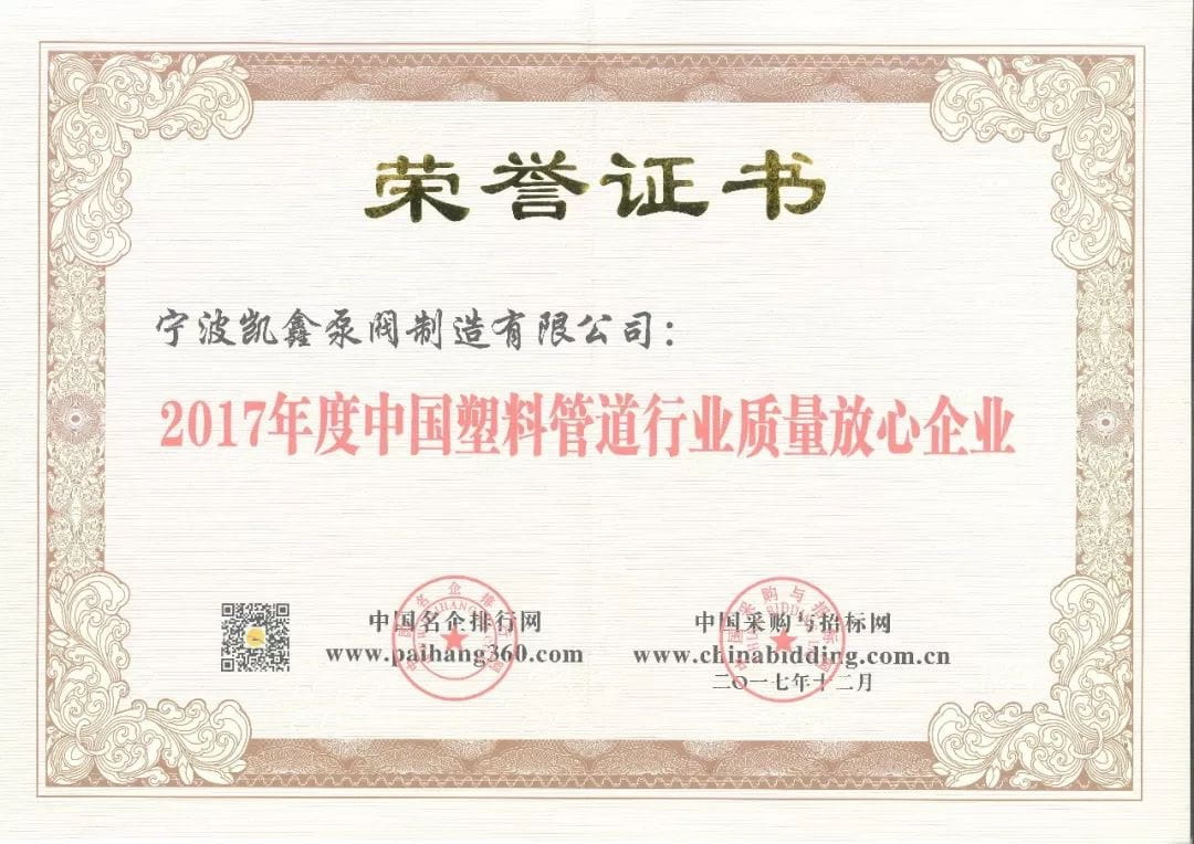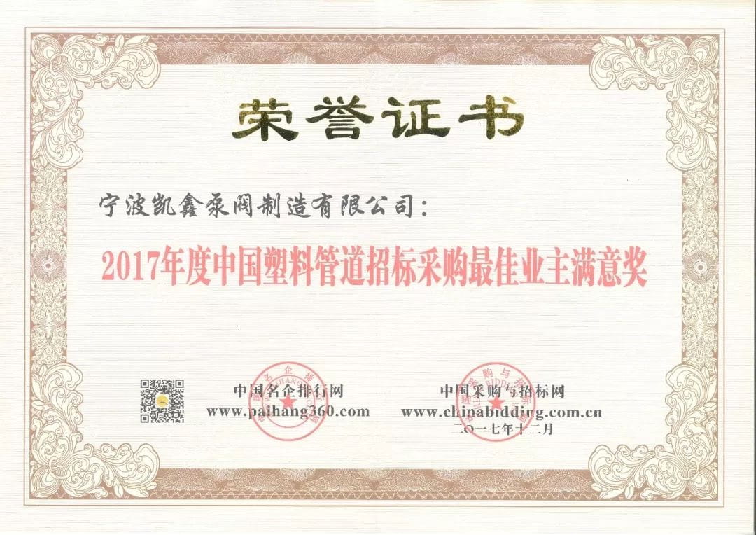 Terdapat lebih daripada 180 syarikat mengambil bahagian dalam aktiviti promosi. Jumlah paparan halaman aktiviti adalah hampir 600W, dan jumlah undian ialah hampir 200W . Ningbo Kaixin Pump & Valve Manufacturing Co., Ltd. ialah salah satu daripada lebih 180 syarikat ini. Daripada penyusunan maklumat pendaftaran pada peringkat awal, kepada pengundian tanpa henti setiap hari oleh semua pekerja syarikat pada pertengahan penggal, kepada semakan menyeluruh oleh institusi dan profesional yang berkaitan di peringkat kemudian, Syarikat Kai Xin telah dipilih dan memenangi 3 anugerah, iaitu: "2017 Jenama Utama dalam Industri Paip Plastik China", "2017 China's As Plastic Pipe17 Enterprise", "2017 China's Best Plastic Pipe17 Enterprise", "2017 China's Best Plastic Pipe" Pembidaan dan Perolehan Paip Plastik" Anugerah Kepuasan".