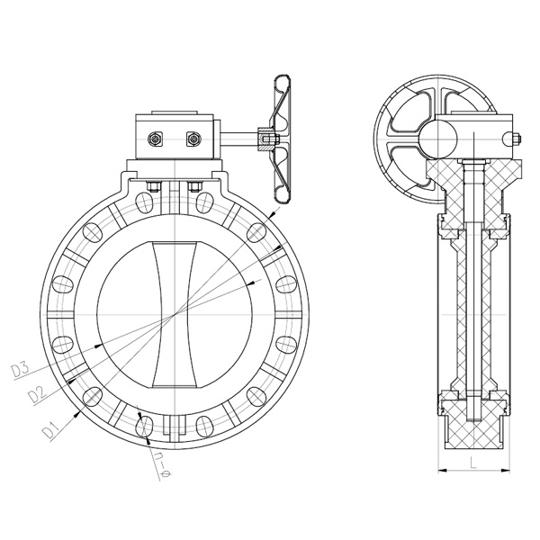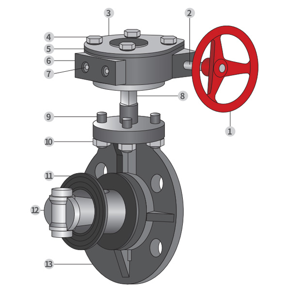 Lukisan Perincian Pemasangan Injap Rama-rama Jenis gear cacing