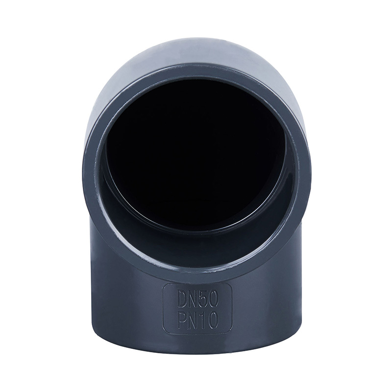 Berkualiti tinggi kelabu gelap PVC-U 90° berbentuk siku DN15-DN600 1.0-1.6 MPa tekanan kerja kelengkapan paip plastik untuk industri kimia dan udara.